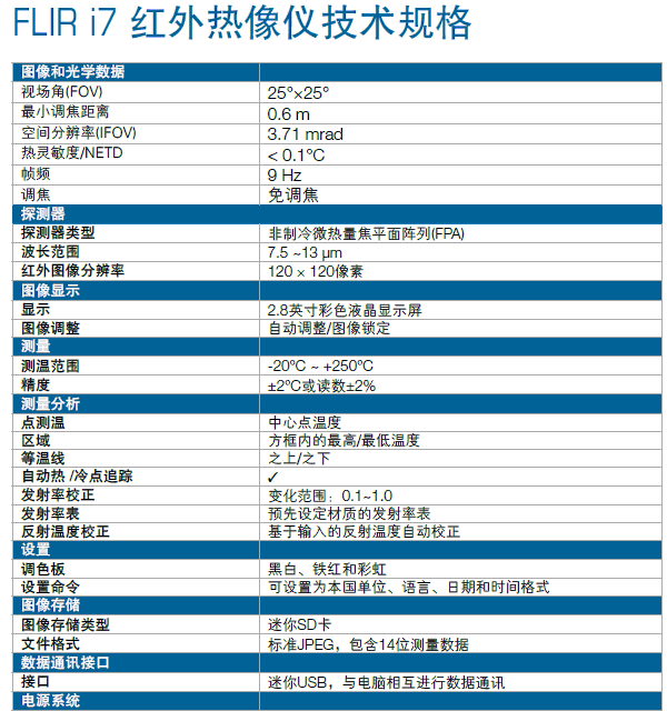 FLIR i7紅外熱像儀性價(jià)比極高,圖像分辨率達(dá)120×120像素,能顯示區(qū)域內(nèi) 最高/最低溫度和等溫線(之上/之下)等數(shù)據(jù),并自動(dòng)追蹤冷/熱點(diǎn)。