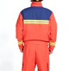 分體款式,套裝包含上衣、褲子; 夾克上衣配長褲設計,消防專用沖孔反光警示帶,上衣和褲子后腰處拉鏈可連接實現連體功能,門襟拉鏈閉合,上衣2個翻蓋貼袋,兩側立體腿袋,臀部、雙肘、雙膝均有主面料雙層補強。