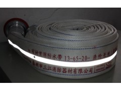 新式反光夜光聚氨酯彩色消防水帶,水帶整條外層帶有進口特殊材質反光條,反光條材料工藝已經跟水帶編織層完全融合,不老化、不脫落、耐磨耐壓;在夜間等陰暗環境能夠反光發光,從而起到位置指引及逃生指引的作用,避免消防人員及逃生人員在火場中被水帶絆倒的危險,也便于使用者在晚上及黑暗場所操作使用。13型Φ65mm,其編織層編織均勻,表面整潔。內襯選用進口的聚氨酯材料,厚度均勻,表面光滑平整,無折皺或其它缺陷。爆破壓力為≥7.5Mpa,直徑膨脹率為≤6.5%,軸向延伸率≤8%,附著強度(N/20m) ≥30,每盤長度20米。符合國家GB6246-2011標準,提供檢驗報告;反光夜光水帶獲得國家專利證書授權生產,水帶接口采用鋁環鎖管液壓綁扎,保證40公斤壓力不脫口,不滲漏,液壓后鋁環表層增加優質交聯聚烯涇材料護套,防寒、防刮手。