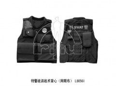 功能特點:戰術背心的結構由背心主體與其上固定或組合的部件構成。網眼布面料戰術背心主體是三層網眼布結構,背心主體分為前片和后片兩部分,由各自下部兩端相互粘貼,調節腰圍大小。背心主體沿邊滾邊,頸圍襯墊發泡墊,領口滾邊內沿周長不小于630 mm。前片正面縫綴兩個肩掛袢、對講機袢、手銬袋、橫袋、左彈匣袋、右彈匣袋;用掛袢和錦絲搭扣固定槍托墊。正中豎向有一條拉鏈,里面是前防彈芯片倉一。前片反面有一個橫向拉鏈,里面是前防彈芯片倉二。左胸粘貼特警戰訓圓形標識。