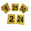 物證牌的形態是用一根線軸連接兩個長方形塑料板材,形成合頁結構,分開兩片可穩定豎立,閉合兩片可方便存放。兩片板材分別印刷1-50號碼,黃底黑字。